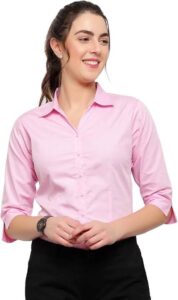 The 3/4 sleeves add a stylish and practical edge—perfect for staying cool and comfortable throughout your workday. Whether paired with formal pants or a skirt, this pastel pink piece delivers a crisp and graceful office look.